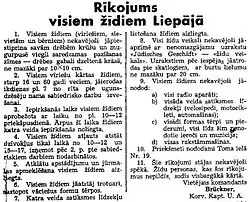 - ^ a b "Rikojums visiem zidiem Liepaia" (PDF). Kurzemes Vārds (in Latvian). No. 4. 5 July 1941. p. 1. Archived from the original (PDF) on 30 October 2018. Retrieved 30 May 2016. Online version from National Library of Latvia website.