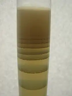 Liesegang rings (/ˈliːzəɡɑːŋ/) are a phenomenon seen in many, if not most, chemical systems undergoing a precipitation reaction under certain conditions of concentration and in the absence of convection. Rings are formed when weakly soluble salts are produced from reaction of two soluble substances, one of which is dissolved in a gel medium.[1] The phenomenon is most commonly seen as rings in a Petri dish or bands in a test tube; however, more complex patterns have been observed, such as dislocations of the ring structure in a Petri dish, helices, and "Saturn rings" in a test tube.[1][2] Despite continuous investigation since rediscovery of the rings in 1896, the mechanism for the formation of Liesegang rings is still unclear.