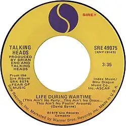 "Life During Wartime" is a song by the American new wave band Talking Heads, released as the first single from their 1979 album Fear of Music.[2] It entered the US Billboard Pop Singles Chart on November 3, 1979, and peaked at number 80, spending a total of five weeks on the chart.[3]