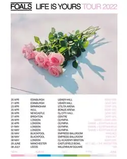The Life Is Yours Tour was a concert tour by British indie rock band Foals in support of the band's seventh studio album, Life Is Yours. The tour started on 20 April 2022 and concluded on 4 September 2023. The remaining dates from the band's Everything Not Saved Will Be Lost World Tour were rescheduled from April 2020 to April 2021 due to the COVID-19 pandemic. Ten months later, in March 2021, Foals rescheduled their remaining concerts to 2022.[1]