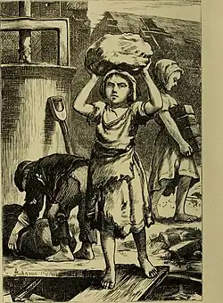 Gender was not a discriminator for how children were treated when working during the industrial revolution. Both boys and girls would start working at the age of four or five. A sizeable proportion of children working in the mines were under 13 and a larger proportion were aged 13–18. Mines of the era were not built for stability; rather, they were small and low. Children, therefore, were needed to crawl through them. The conditions in the mines were unsafe, children would often have limbs crippled, their bodies distorted, or be killed.[11] Children could get lost within the mines for days at a time. The air in the mines was harmful to breathe and could cause painful and fatal diseases.