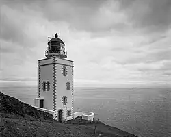 Pladda lighthouse is a white tower with a height of 29 metres.[2] It is the oldest of the Arran lighthouses and situated on the Isle of Pladda just off the Southern tip of the Isle of Arran. Pladda lighthouse is not only the oldest lighthouse around Arran but also one of the oldest lighthouses in Scotland. Pladda lighthouse was built in 1790 by Thomas Smith and showing a lower light from a small lantern 20 feet below the main light to allow seafareres to distinguish Pladda from other lighthouses close by, notably those on the Mull of Kintyre, Cumbrae and Copeland at the Irish coast. The lighthouse was rebuilt between 1821 and 1830. Pladda was one of Northern Lights' lighthouses where paraffin as a new fuel together with multiple wicks were tested successfully in 1870. This allowed substantial savings with a simultaneous increase in power between 10% and 100%. Fog signals were introduced in the 1870s as well. In 1901, the formerly fixed light was changed to a more powerful group-flashing which was Northern Light's plan for most Scottish lighthouses at the time.[3] Pladda lighthouse operates fully automatic since 1990. Pladdas position is 55° 25.512'N, 005° 07.113'W. Its light flashes Fl.(3)30s40m23M.[4]