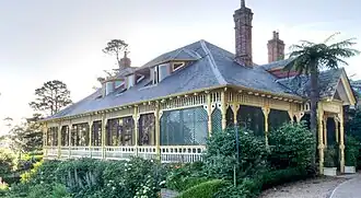 Several wide verandahs surround it; the main one along the front and the two sides feature turned timber posts with decorative timber fretwork valances and railings. The side verandah features a coloured leadlight window. The verandahs feature substantial turned posts, timber balustrading, turned valance joinery and exposed rafter ends. The treads of the steps up to the verandah have been formed from single pieces of slate, whilst risers have been tiled.[1]