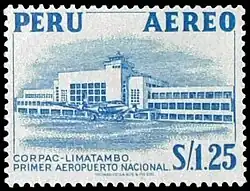 The airport's modernisation was overseen by CORPAC, with construction finishing on September 23, 1948, under the government of José Luis Bustamante y Rivero, in honour of Jorge Chávez's fight across the Alps.[3] A new terminal was built to replace the former building that was inaugurated in 1935,[4] with Bustamante now being present at the re-inauguration ceremony.[4] When construction works were finished, the airport had a total area of 1’614.132 m2, and was surrounded by cornfields.[3][5] In its heyday, it saw the arrival of international figures, such as John Wayne, Johnny Weissmüller, Mario Moreno, Obdulio Varela, Nat King Cole, Dolores del Río and Pedro Infante, among others.[3][4][5] Due to this, a common sight at the airport was that of fans waiting for a celebrity to leave the terminal.[3]