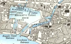 At about this time the Lee trustees, who were afterwards alleged to be too cosy[55] with the Regent's Canal Company, agreed to sell it the southern portion[56] of the Limehouse Cut. Since it was public trust property it could not be done without the sanction of Parliament, to whom a Bill was presented.[57] The nearby Regent's Canal Dock, already enlarged to a 9-acre basin, was crowded with shipping so the Company intended to enlarge it further, absorbing Limehouse Cut's lock and the remnants of its basin.[58]