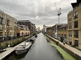 The Cut is about 1.4 miles (2.2 km) long.[1] It turns in a broad curve from Bow Locks, where the Lee Navigation meets Bow Creek; it then proceeds directly south-west through Tower Hamlets, finally making a short hook to connect to Limehouse Basin.