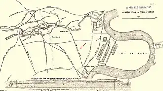 In 1849 James Rendel was asked to devise a scheme to improve the infrastructure, which was dilapidated. He reported that "if [the Navigation] is to compete successfully with Railways, it should be made an efficient branch of the Thames, viz. navigable by the largest class of barges there employed".[24] He proposed, besides numerous improvements on the river proper, the reconstruction of Bromley Lock; deepening the Limehouse Cut; forming a towing path under Britannia Bridge (Commercial Road); and the construction of a new outfall lock into the Thames, with cills 19 feet below Trinity High Water, and with tide gates.[25]