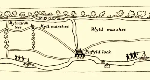 At the northern end of the Cut was a conflict with a property called Four Mills, which was in fact a group of five tidal water wheels.[16] Nathaniel Beardmore, the Lee trustees' engineer, described the conflict as it was in early Victorian times: