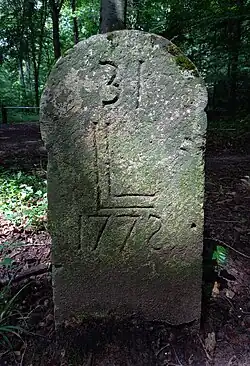 Nicolas de Jamez,[1] [2] Chief Engineer of the Fortress of Luxembourg, demarcated in 1772 the Bambësch forest that belonged to the City of Luxembourg, during the reign of Her Majesty Maria Theresa of Austria, Duchess of Luxembourg which was one of her many titles. This demarcation is the Limes Luxemburgensis (LL): 94 stone markers numbered 1 to 94 were put in place, accompanied by the 1772 LL map. Each marker has the following inscription: a unique consecutive number, the letters LL and the year 1772. As of today, 63 markers have been located and photographed.