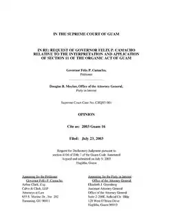 - ^ a b Governor Felix P. Camacho v. Douglas Moylan, Office of the Attorney General in re: request of Governor Felix P. Camacho relative to the interpretation and application of section 11 of the Organic Act of Guam (2003 Guam 16), Supreme Court of Guam Case No. CRQ03-001