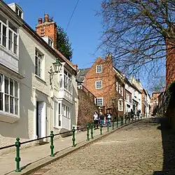 The city centre is divided into Uphill, Downhill, Steep Hill, Cornhill, Brayford and past the railway station.[4][5] These areas are connected by the ancient Ermine Street which is known as the High Street, in Downhill the High Street becomes The Strait then Steep Hill connects to Uphill where it becomes Bailgate.