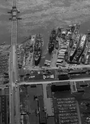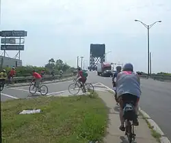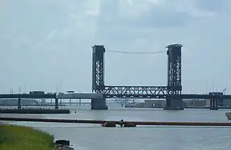 The bridge's lift span is 222.1 feet (67.7 m) long.[31] It and that of the next upstream vehicular vertical bridge (the Wittpenn) are required by federal regulations be raised on demand at all times.[36][37] The Lower Hackensack River is channelized to MP 3.4, where there is a turning basin.[38] At one time the river was major waterway for the Port of New York and New Jersey.[39][40] It remains partially navigable for commercial maritime traffic, notably coal deliveries to the Hudson Generating Station.[41] In 1936, the predecessor to the current bridge is reported to have opened as frequently as 48 times per day. In 2005, the Lincoln Highway Bridge opened 20-30 times per month.[39] As of 2014, the bridge opened 1000 per year.[42]