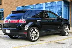 The 2007 MKX debuted in December 2006 as a rebadged variant of the Ford Edge. In addition to the chrome grille, the MKX's front fascia features projector-beam headlight assemblies with standard chrome-accented fog lights mounted in the lower fascia. The MKX features an optional adaptive headlight system that pivots the aim of the light projectors to match the steering inputs of the driver. In the rear, the MKX features dual chrome exhaust tips and brake lights backlit by LEDs with a light bar that crosses the MKX's liftgate. The optional sunroof, marketed as a Panoramic Vista Roof, is the production version of the glass roof feature shown on the 2004 Aviator Concept. The Vista Roof features a forward power sunroof and a fixed rear moonroof with dual power sunshades.[6][7]