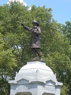 - The Farrier Memorial, a 6-foot (1.8 m) bronze statue of a firefighter atop a domed granite base of 15 feet (4.6 m), was a bequest by Police Captain Frederick T. Farrier to honor the Volunteer Fire Department and was dedicated on November 21, 1931.[38]
