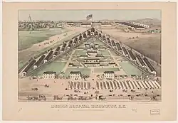 During the Civil War, it became the site where Lincoln Hospital was built to take care of the wounded Union Army soldiers. While there were many others around the city, it was the largest in the area built by the Army. It included 20 pavilions arranged in a V formation. 25 tent wards provided beds for 2,575 wounded. Covered pathways connected the kitchen and dining rooms.[4]