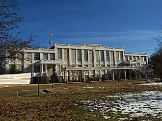 The building is three stories, with a partially sunken first story, and constructed of cast reinforced concrete. The style is similar to that of the main mill buildings, but with Beaux-Arts details. The front and rear of the building have large, multi-pane windows separated by thick concrete columns.[4] Its oversized structural elements led the maintenance staff to say that the building "could probably be rolled end-over-end without hurting it much."[7] The central portion of the façade is raised 6 feet (1.8 m) to add visual emphasis and provide a higher ceiling for the third-floor auditorium. The roofline terminates with a stepped parapet. The center section is flanked by two second-floor entry porticos, each supported by four Tuscan columns. Each floor has a central hallway with classrooms on either side, with restrooms on the ends. The third floor has a large auditorium in the middle with original incandescent lights, that has been converted into a library.[4]