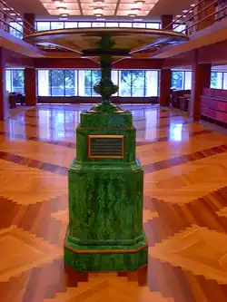 "The Tazza", one of the largest pieces of malachite in North America, stands as the focal point in the center of the main reading room, which features parquet wood floors, paneling and bookshelves of oak, and large windows that overlook the south lawn.