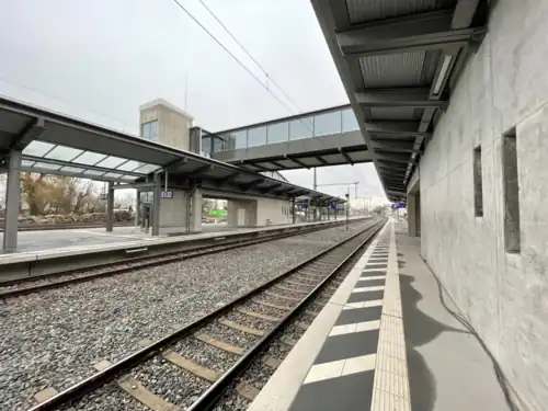 Lindau-Reutin station is a junction station in the town of Lindau (Lake Constance), where the Aeschach curve branches off from the Vorarlberg Railway (Lindau-Bregenz–Bludenz). It is also a border station with Austria. In the course of the reconstruction of the Lindau rail hub, which began in 2016, the rail facilities, which were last used only as a goods station, were expanded into Lindau's new long-distance train station, which went into operation in 2020. In contrast to the terminus station Lindau-Insel (until 2020: Lindau Hbf), which opened in 1854, the station in the most populous district Reutin is a through station on the mainland. A station for local passenger services opened at Lindau-Reutin as Lindau-Lokalbahnhof in 1876 and was known as Lindau-Ost from 1911 but the last passenger services to it ended in 1980. The station building is located on Bregenzer Straße, on a level with Berliner Platz.