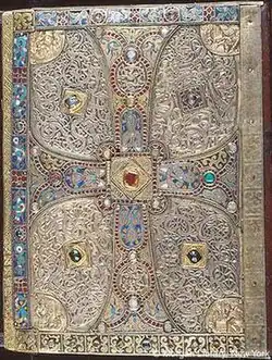 The Lindau Gospels is an illuminated manuscript in the Morgan Library in New York, which is important for its illuminated text, but still more so for its treasure binding, or metalwork covers, which are of different periods. The oldest element of the book is what is now the back cover, which was probably produced in the later 8th century in modern Austria, but in the context of missionary settlements from Britain or Ireland, as the style is that of the Insular art of the British Isles. The upper cover is late Carolingian work of about 880, and the text of the gospel book itself was written and decorated at the Abbey of Saint Gall around the same time, or slightly later.[1]