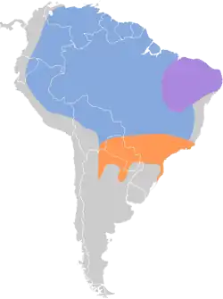It is found in Argentina, Bolivia, Brazil, Colombia, Ecuador, French Guiana, Guyana, Panama, Paraguay, Peru, Suriname, and Venezuela. Its natural habitats are subtropical or tropical moist shrubland, pastureland, and heavily degraded former forest.