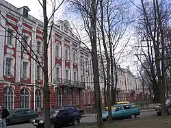 Kadetskaya liniya (Cadets' Line) was given its name after the 18th century military academy (Rus. Первый Кадетский корпус (Perviy Kadetskiy korpus 1st Cadets' Corps)). The academy was located at the beginning of the street in the land originally granted by Peter the Great to his powerful courtier Alexander Menshikov. The academy was granted the plot including the Menshikov Palace after Menshikov's fall from power.