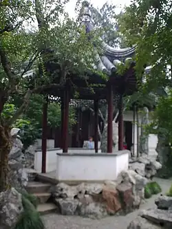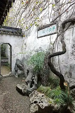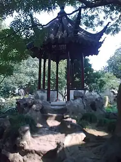 The 23,310 m2 garden is divided into four distinctly themed sections; East, Central, West, and North.[4] The Central area is the oldest part of the garden. Buildings, the primary feature of any Chinese garden, occupy one third of the total area. A unique feature of this garden is the 700m of covered walkway which connects them.[4] The built elements of the garden are grouped by section.[5] The ensemble of structures in the central garden encircles a pond and grotto main feature. The grotto is constructed of yellowstone granite and was created by the noted artist Zhou Binzhong. The eastern section of the garden is arrayed around the cloud-capped peak stone. A central courtyard is ringed by buildings. Behind the Old Hermit Scholars' House is the Small Court of Stone Forest, a collection of Scholar stones and connected minor courtyards. The western section is mostly natural, containing only a few pavilions, a large artificial hill, and a Penzai garden.