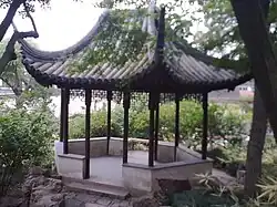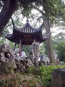 A freestanding structure on the pond. The name is from two famous angling resorts called Hao and Pu; however, it also alludes to The Happiness of Fish (魚之樂), a dialectic conversation between Zhuang Zi and Hui Zi. Ultimately, the name expresses the desire of the owner for a simple life. It faces three of the 12 famous scholar stones of Liu Su's Collection; The Moon, The Magic Fungus, and The Cockscomb. It is a freestanding square pavilion with a hipped gable roofline, and ornamented flying eves. |