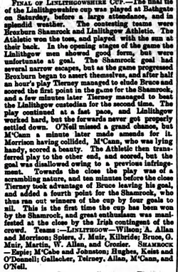 The only competition in which the Athletic had any level of success was the Linlithgowshire Cup, which generally had entrants in the single digits. Even the Athletic's one appearance in the final, in 1893–94, was aided by considerable fortune. The club protested a first-round defeat to the original incarnation of Uphall because of the non-registration of one player, and won the replayed tie. Its next opponent - Armadale - was disqualified before the tie was played because it did not provide a list of players from its tie with Bo'ness.[8] That was enough to put the Athletic in the final, against Broxburn Shamrock at Bathgate, and the Shamrock won 4–0.[9]