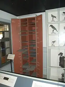 According to Benjamin Daydon Jackson, the Linnaean Herbarium contains 13,832 plant sheets, and several zoological specimens.[1] These specimens represent species from every continent, contributed by about 150 individuals.[1] The herbarium's organisation largely reflects how Linnaeus's son left it in 1783. Specimens are arranged by genus, each given a number. Within each genus, individual sheets are numbered sequentially.[11] Linnaeus designed functional herbarium cabinets with adjustable shelving, allowing for dynamic and flexible organisation to accommodate new discoveries and rearrangements.[4] Specimens are usually authenticated by a number corresponding to the species in the first edition of Species Plantarum (1753). Linnaeus used a unique system to mark specimens acquired after Species Plantarum. Species collected up to the 10th edition of Systema Naturae (1759) were marked with capital letters. The second edition of Species Plantarum (1762–63) introduced a new numbering system, which was not applied to the herbarium.[2] The herbarium is internationally recognised by its standard herbarium code LINN, which is used to uniquely identify this collection in scientific literature and databases.[12]