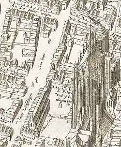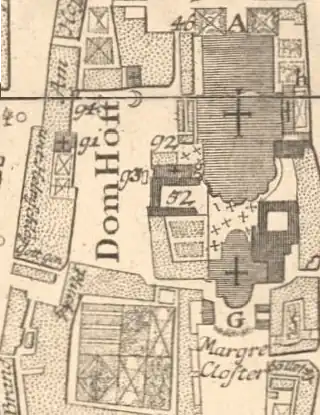 The Hof was a hereditary monastery yard of the Cologne Cathedral monastery,[1] which was used as a canonic house. It was located immediately south of the choir building of Cologne Cathedral on the Domhof, east of the church of St. Johann Evangelist.[2]