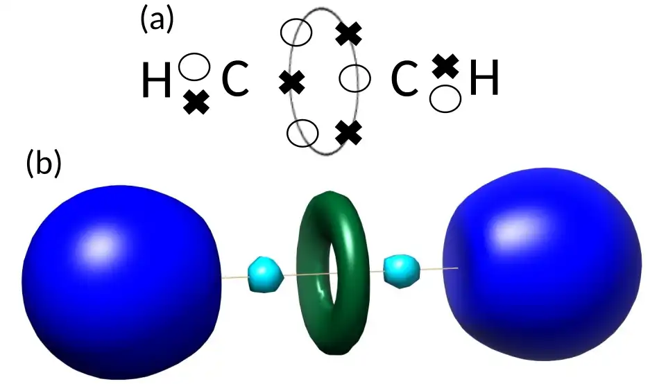 The ELF of acetylene thus contains a toroidal basin surrounding the carbon-carbon bond axis, rather than three discrete concentrations of electron density as would be expected from the Lewis structure for a triple bond. This is directly comparable to the bonding picture produced using LDQ theory (see above), highlighting that the theory can accurately reflect the bonding situation in multiply-bonded species.[4]