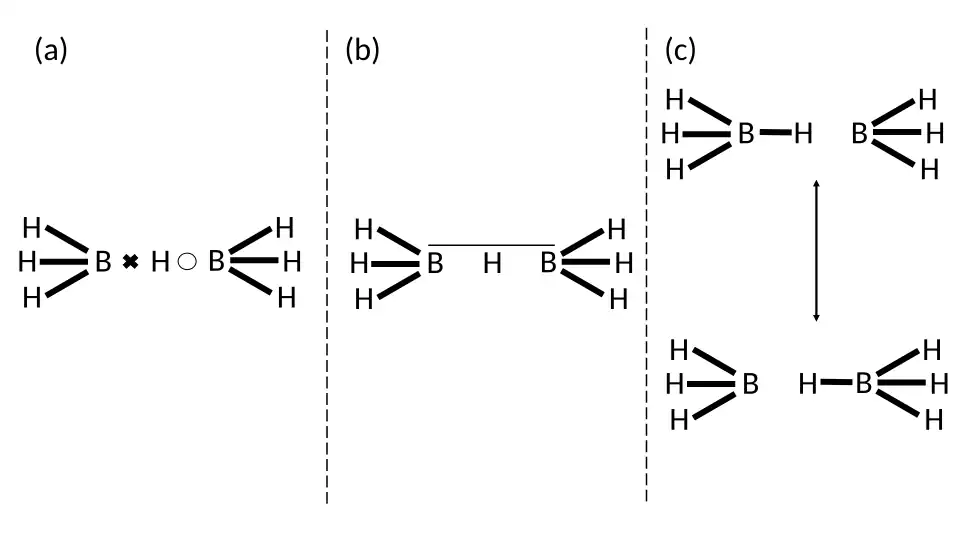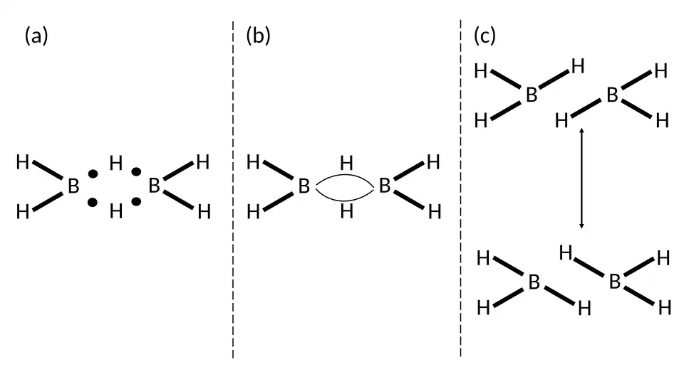 Similarly, the resonance forms shown above also increase the degree of inter-electronic repulsions as the electrons are paired up in the boron-hydrogen bonds. Thus, a more complete description of the bonding in B2H7− is obtained using LDQ theory as it can utilise two two-centre one-electron bonds, in comparison with the awkward three-centre two-electron bond or the resonance structures derived from the valence bond method.