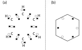 The 2D LDQ structures of benzene using both the full dot-and-cross diagram and the simplified diagram are shown on the right. Again, the bonding situation determined using LDQ theory is in good agreement with molecular orbital theory results.[2][18] This also highlights that the additional degree of freedom afforded by having two distinct spin sets in the LDQ approach allows a single electron in a bond to be shared equally between two atoms, which produces the above structure for benzene.