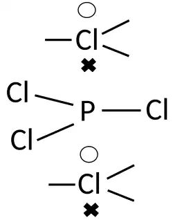 LDQ theory, however, presents a different view of the bonding in this molecule. The three equatorial chlorine atoms each form two-electron bonds with the central phosphorus atom. The remaining two axial chlorine atoms each contribute only one electron to a bond with the phosphorus atom, leaving a single electron to reside exclusively on the chlorine atom. Thus, the LDQ structure for PCl5 consists of three two-centre two-electron bonds and two two-centre one-electron bonds, thus satisfying the octet rule and dispensing with the need to invoke hypervalent bonding. This LDQ structure is also in good agreement with quantum chemical calculations.[18]