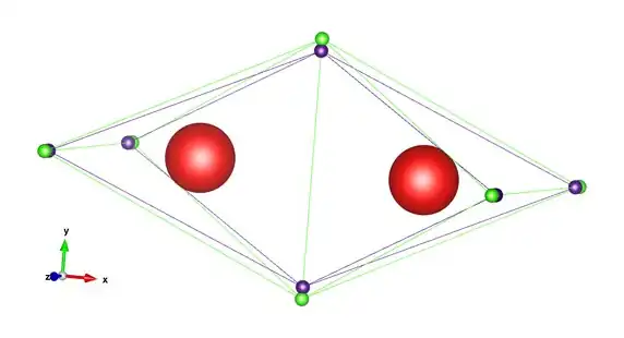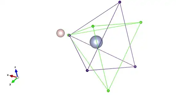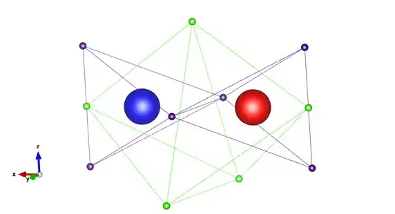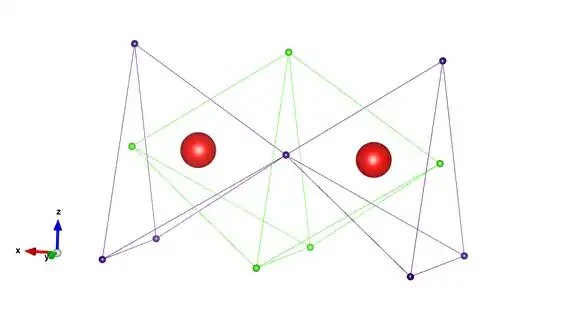 There are seven valence electrons of one spin which occupy two tetrahedra that share a common vertex (purple spheres), and the remaining five valence electrons of the other spin occupy two tetrahedra which share a common face (green spheres). Linnett postulated that this electronic arrangement reduces the magnitude of the inter-electronic repulsions in comparison with the case where the two spin sets have six electrons each. This arrangement results in a bond order of 2 and an excess of one electron spin, giving rise to the molecule's paramagnetism: both observations are in agreement with molecular orbital theory treatments of the molecule. In effect, the LDQ structure is equivalent to the combination of a two-centre one-electron bond (purple spin set) and a two-centre three-electron bond (green spin set).