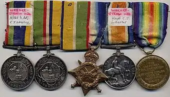 ![]() The Lint voor Wonden, as worn by Captain C.J. Lourens DTD of the Union Defence Forces, former Assistant Field Cornet and Adjutant of Wakkerstroom Commando during the Anglo-Boer War. The awards depicted are the Dekoratie voor Trouwe Dienst, Medalje voor de Anglo-Boere Oorlog, Lint voor Wonden, 1914-15 Star, British War Medal and Victory Medal, the last two mounted with reverse displayed. | |