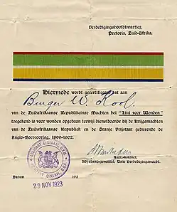 The Lint voor Wonden / Lint voor Verwonding, officially designated Lint voor Verwonding Opgedaan Gedurende de Anglo-Boere Oorlog, 1899–1902 (Riband for Wounds Sustained During the Anglo-Boer War, 1899–1902) and referred to as the Lint voor Wonden in some subsequent official documents, was instituted in terms of Government Notice no. 2307 dated 21 December 1920 and published in the Union of South Africa Government Gazette of 24 December 1920. It was a retrospective award for Boer veteran officers and men who were wounded in action while serving in the combat forces of the South African Republic and the Orange Free State during the Second Boer War between 11 October 1899 and 31 May 1902.[1][4]
