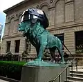 Often, when a Chicago major league sports team is making a strong postseason run, the sculptures will be adorned with oversized mock-ups of hats or helmets in order to show support for the team.[3][15] The first instance of this came in 1985, when the statutes were decorated with mockups of football helmets to celebrate the Chicago Bears appearance in Super Bowl XX. The sculptures were decorated with helmets again in 2007 when the Bears appeared in Super Bowl XLI,[26] as well as in 2011 when the Bears appeared in the NFC Championship Game.[27] The sculptures were decorated for the Chicago Blackhawks during their Stanley Cup Finals appearances in 2010,[26] 2013,[28] and 2015.[29] During the 2021 WNBA Finals, the sculptures were decorated for the Chicago Sky for the first time (having previously not been decorated for the team's' earlier appearance 2014 WNBA Finals).[30][31] The sculptures were decorated for the Chicago White Sox's appearance in the 2005 World Series,[32] and the Chicago Cubs' appearance in the 2016 World Series.[33][34] Additionally (unrelated to any postseason appearance) the statues had previously been decorated with Cubs hats (created by Carol Terry of the Ryerson Library) for a special “Lion Cubs” event held at the museum entrance in early October 1984.[35]