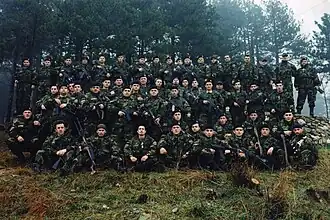 The unit was formed in mid-2001 by the then-interior minister Ljube Boškoski during the insurgency in Macedonia. He named the unit after the hotel he owned in Croatia and his brand of wine.[2] It was an unauthorized entity of former police and military reservists.[3] Most were also members of VMRO-DPMNE and some had criminal records.[4] It also functioned as a VMRO-DPMNE-based paramilitary.[5] Its personnel were all ethnic Macedonians but they had minimal contact with Albanians and were mostly used to provide security for Macedonian villages.[6] After the conflict, it was transformed into an official police unit.[3] The unit went to secure mass graves in the Tetovo area in November but it was ambushed and three members were killed by Albanians. In December, an Albanian farmer was killed by the police near Šemševo, with the Lions being the main suspects.[7] The Lions displayed shows of force in Albanian areas in January 2002 and during the election campaign in September 2002.[2] They actively threatened ethnic cleansing against Albanians.[3] The unit, along with the unit Tigers, was recorded assaulting workers, opposition journalists, media personnel, political activists and random civilians, and also threatening opposition politicians.[8] In 2002, four members of the unit were involved in the killing of six Pakistani citizens and one Indian citizen, who were claimed to be terrorists. They were charged with murder but were acquitted in 2005.[9][10]