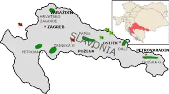 During the war, the Austro-Hungarian Army saw mass desertions of conscripts from rural areas who escaped from barracks, hospitals or never reported back after a leave. Most lived at home and only fled to nearby forests to evade gendarmes when warned by local population.[6] In 1917, the deserters were first referred to as the Green Cadres by the authorities in the Croatia-Slavonia.[7] By September 1918, there were about 50,000 Green Cadres among the Croats, Serbs, and Bosniaks (about 10,000 in Bosnia, and the bulk in Croatia-Slavonia).[8] Petrova Gora, Fruška Gora, Zrinska Gora, and Papuk mountains, as well as Hrvatsko Zagorje, and the surroundings of the village of Dalj saw large numbers of the Green Cadres.[9]