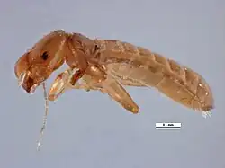This insect is about 1 millimetre (0.039 in) long, brown in color, and wingless.[2] Females of this species often undergo parthenogenesis and populations consist almost entirely of females. A male specimen was not noted until 2002 and a few years later, another sexually-reproducing strain was found.