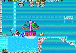 Liquid Kids is a platform game where players assume the role of Hipopo, a hippopotamus who fights his way across various stages set in the land of Woody-Lake against enemies led by Fire Demon in search of his missing girlfriend Tamasun while rescuing other hippos along the way.[2][3][4][5] Hipopo is armed with water bombs that can be thrown at enemies to soak and damage them. Once soaked, enemies can be kicked and destroyed completely.[4][5] Undefeated enemies will dry out and recover after a short time period. Small plants also appear on certain levels which can be "watered", causing them to grow and creating new platforms. He can also collect cakes and other items to gain more points.[4][5] Getting hit by enemies results in losing a life, as well as a penalty of lowering Hipopo's status to his original state. There is also an invisible time limit. If the player takes too long to complete the stage, a jingle will play along with "Hurry Up!" music and the screen will get dimmer, along with the little demon from the Hipopo and Tamasun cutscenes chasing the player until he catches them. The game is over once all lives are lost, unless players insert more credits into the arcade machine to continue playing.[4][5]