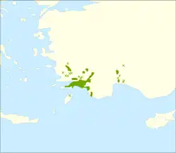 The forests of this Tertiary relict endemic taxon are found notably within a specially protected area between Dalyan and Köyceğiz in Muğla Province, Turkey, where a 286 ha (710 acres) zone is set aside as a nature reserve and arboretum for the preservation of the species. A large stand also surrounds Marmaris. Another sweetgum forest area of 88.5 ha (219 acres) under protection is situated in Burdur's district of Bucak alongside Karacaören dam reservoir on the road to Antalya.[5] The trees are also found locally in Denizli's districts of Beyağaç and Tavas.[6] The total area of pure sweetgum forests in Turkey covers 1,348 ha (3,330 acres), all in the southwestern regions of the country. The present-day extension corresponds to a marked decrease since the 1940s level of 6,000–7,000 ha (15,000–17,000 acres), although the protective measures and infrastructure in place since the 1980s helped stop loss of stands and led to slight improvements. The species is also found on the Greek island of Rhodes, in a riparian forest inside a narrow, steep valley on the island's north coast.[1]