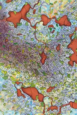 In exhibitions between 2010 and 2017—at Lesley Heller, Spanierman Modern, Galerie Gris and Gerald Peters (New York), Zolla/Lieberman (Chicago), and Mayor Gallery (London)—Davis extended the complexity of her themes and abstract syntaxes.[3][35][36][37] Her proliferating forms—seemingly drawn from microscopic and macroscopic realms (cells, roads, maps, city grids, geographic fault lines), as well as the mechanical world of circuits and motherboards—charted concepts encompassing the urban experience of space and time, the fragmentation of contemporary life, and the diverse, intersecting strands of identity.[5][3] Critics described them as "haphazardly rendered topographies or warped atlas pages"[3] delicately balanced between organic chaos and linear order, whose titles (e.g., Psychopathic Territory and Psychotropic Turf, both 2015) undermined their reliability as maps.[5] Joan Waltemath suggested these ideas were offset by humor and irreverence, expressed through Davis's use of outline as a kind of doodling gesture in works such as Flim Flam Plan (2015).[5]