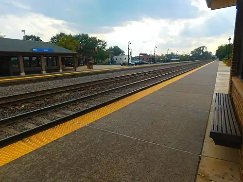 Lisle station is a commuter railroad station along Metra's BNSF Line in Lisle, Illinois. The station is at 1000 Front Street, 24.4 miles (39.3 km) from Union Station, the east end of the line.[2] As of 2018, Lisle is the 10th busiest of Metra's 236 non-downtown stations, with an average of 1,895 weekday boardings.[1] It is near the Village Hall on Burlington Avenue and the St. Joan of Arc School. Parking for the station is also available near these locations, as well as further east near St. Joseph Creek Road and as far north as Ogden Avenue. Amtrak trains pass through the station but do not stop.
