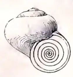 They are small, thin, of rather delicate texture (with the exception of Lissospira rarinota), opaque white, and slightly lustrous. Their shell consists of few convex whorls forming an elevated spire, with a relatively large, prominent nuclear whorl and a large body whorl. The suture is deep. The umbilicus is small, deep, and does not show any whorls. The aperture is somewhat oblique, circular with a slight sutural angle, and not modified by the body whorl to which the simple, continuous peritreme is but slightly attached. The aperture often has an indistinct thread just within the inner lip, fading out above and below, so that it extends but about halfway round the aperture. It is much nearer the edge along the columellar margin than at the ends and is evidently to prevent the thin operculum being drawn in too far. The operculum is circular, thin, of a delicate horn color, with a central nucleus. It has about seven whorls, defined by a distinct spiral thread, often showing delicate, microscopic transverse growth lines. The radula consists of numerous rows of delicate teeth. Each row hasone broad central, or median tooth, with a broad, blunt, delicately serrate, curved tip and on either side four more slender lateral teeth also with blunt, curved, delicately serrate tips, beyond which is a series of numerous, between 30 and 50, long, very slender, somewhat sickle-shaped hooks sometimes with delicately serrate tips.[2]
