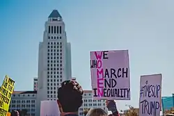 600,000[90][91] | According to Los Angeles Mayor Eric Garcetti, about 600,000 marched in Los Angeles, from Pershing Square to Grand Park and the City Hall on the morning of January 20, calling for equal rights for women in a rally that reflected the rise of the #MeToo and #TimesUp" movements. From 9 a.m. to 4 p.m.,[92] they marched to end violence, and to protect the rights of women, workers, people with disabilities, immigrants, indigenous peoples, and environmental and civil rights.[93] | ||