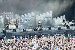 After the Death Row touring cycle, Schwarzmann was replaced by Michael Cartellone, who performed on 1996's Predator.[12] The group disbanded for a second time in 1997.[3] In 2005, Accept returned for a short run of shows in Europe and Japan, with Dirkschneider, Hoffmann and Baltes joined by Frank and Schwarzmann.[13] The tour ended in August, after which Hoffmann claimed that Dirkschneider was preventing a longer reunion for the band.[14] Members returned to other projects until 2009, when a new lineup of Accept was unveiled with vocalist Mark Tornillo in place of Dirkschneider.[15] The group's lineup remained stable until 2014, when Frank and Schwarzmann were fired.[16] Their places were taken in April 2015 by Uwe Lulis and Christopher Williams, respectively.[17] Baltes quit the band in November 2018.[18]