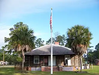 NRHP-listed[1] Single-story, T-shaped cypress log building with truss roof[2]