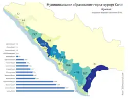 As of 2004, there were "around 50-60 Armenian villages" in Abkhazia.[42] According to the 2011 Abkhazian census, Armenians formed the majority of the population of the Sukhumi District (6,467 Armenians, 56.1% of the total 11,531), and plurality in Gulripshi District (8,430 Armenians or 46.8% of 18,032) and Gagra District (15,422 Armenians or 38.3% of 40,217).[43]
